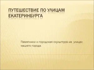 Скульптуры имеют основательный постамент, который возносит фигуры над людьми. Это памятник Танкистам и памятник Свердлову. (слайд 3) Они массивные и величественные. Один из самых монументальных памятников – комплекс со скульптурой Ленина на площади. Так же величественно выглядят статуи на здании администрации города.(слайд 4), столь же монументален каменный памятник Малышеву. Глубокое впечатление производит памятник семье Романовых, (слайд 5) не смотря на то, что это достаточно современная скульптура, к таким же современным, но выполненным в духе монументальной скульптуры относятся памятники основателям города и жертвам Афганской войны. (слайд 6). Все эти скульптуры рассчитаны на возвышение героев, они воспевают людей, заставляя чувствовать трепет и благоговение перед их величественным видом. Но это было в прошлом, современность наступает, и увидеть ее можно в городской скульптуре. (слайд 7). Упрощение, приближенность, возможность потрогать – вот что есть современная декоративная скульптура. На нее можно забраться, приобнять и сфотографироваться, такие скульптуры располагаются на центральных улочках – улица Вайнера.