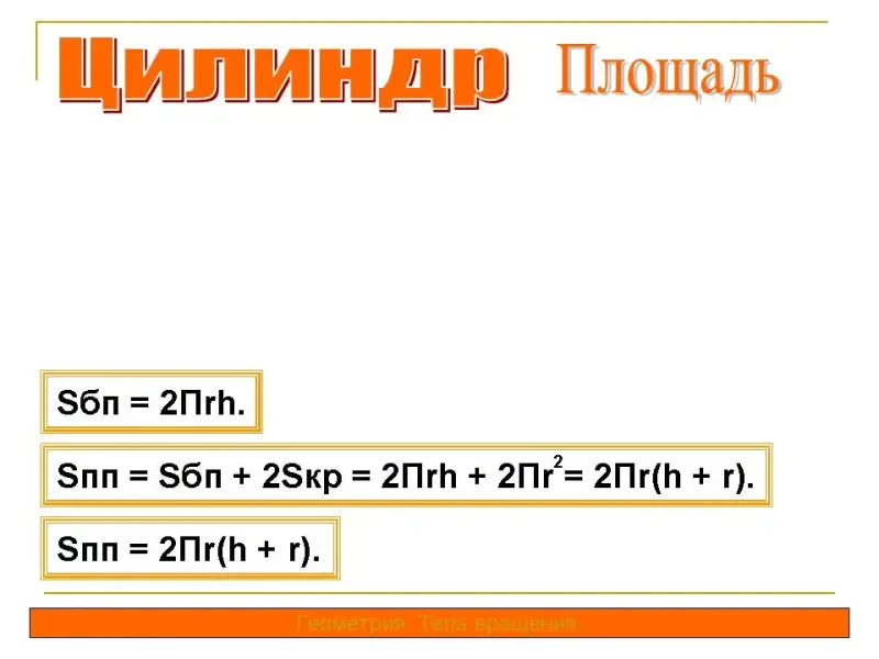 - развёртка боковой поверхности цилиндра, вывод формул площадей боковой и полной поверхностей цилиндра; <слайд 4>