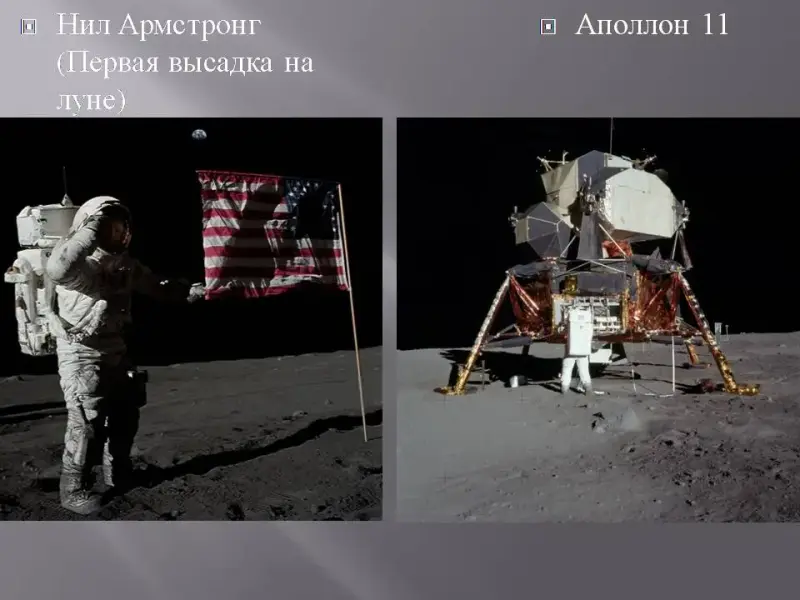 - Следует отметить, что в 1969г. в исследовании космоса произошло событие, сопоставимое по значимости с первым полетом в космос Гагарина. Американский космический корабль «Аполлон-11» достиг Луны, и двое американских астронавтов 21 июля 1969г. высадились на её поверхность. Нил Армстронг оказался первым гостем с Земли на нашем спутнике.