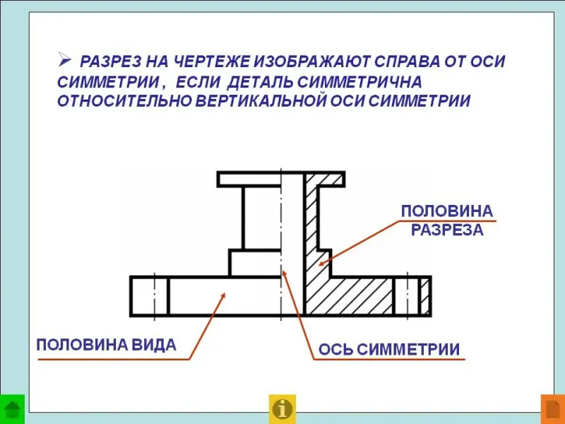 Учитель: Чтобы иметь полное представление о форме детали, целесообразно соединить половину вида и половину разреза. Границей между ними является штрихпунктирная тонкая линия - ось симметрии. Такой способ построения разреза применяется только в деталях, имеющих симметричную форму.