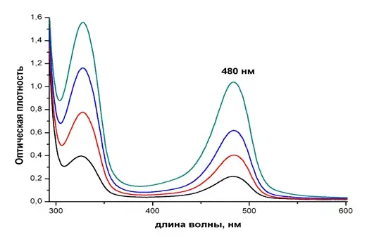 В результате реакции получается ауриновый краситель розово-красного цвета. Электронный спектр поглощения данного соединения представлен ниже (рис. 1). Из данного рисунка видно, что продукт реакции глюкозы с фенолом в среде серной кислоты имеет максимум поглощения на длине волны 480 нм. В дальнейшем данную длину волны использовали для построения калибровочного графика (рис. 2).