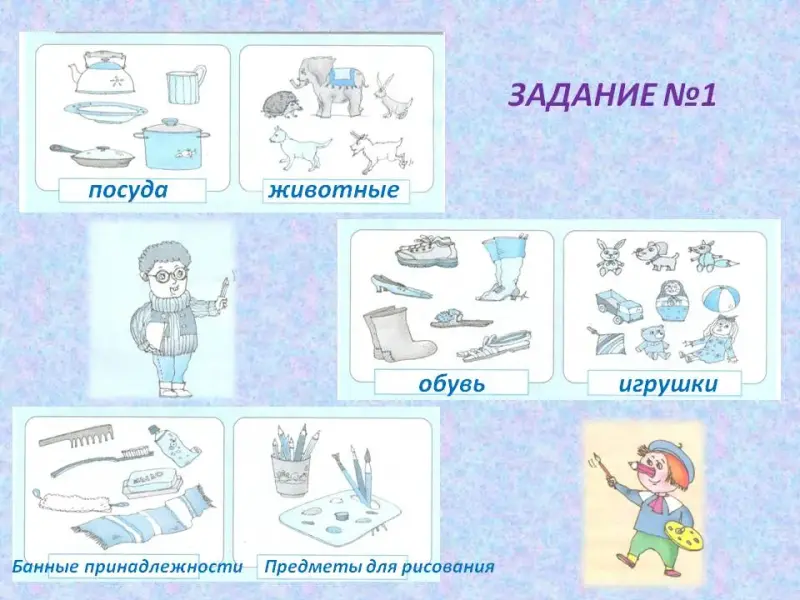 После игры на доске появляется еще один мешок, в котором перечислены названия предметов, но нет общего названия. Его дети должны придумать сами. Например, сапоги, валенки, кроссовки, ботинки, тапочки.