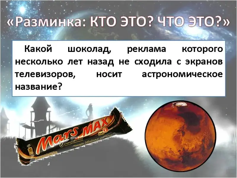 Какой шоколад, реклама которого несколько лет назад не сходила с экранов телевизоров, носит астрономическое название? (МАРС)