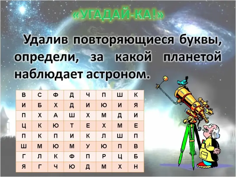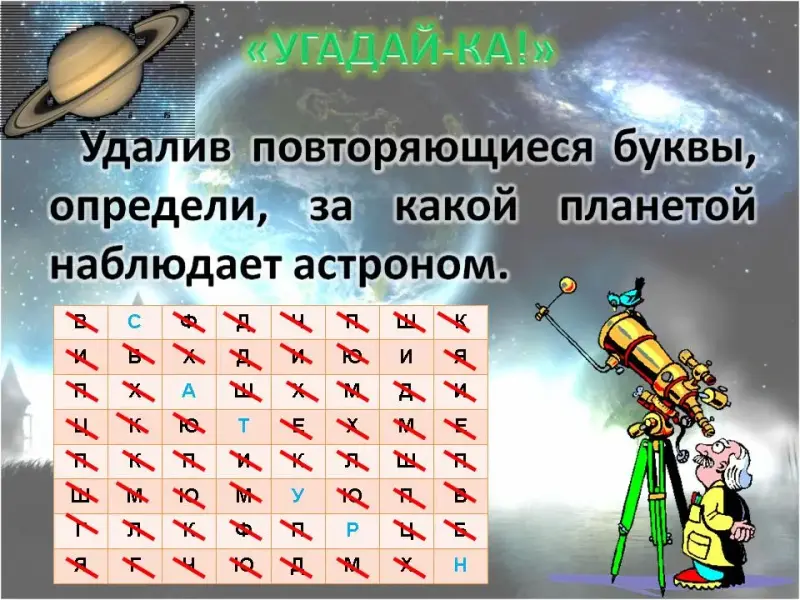 Удалив повторяющиеся буквы, определи, за какой планетой наблюдает астроном. (САТУРН)