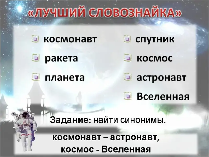 3. Лучший словознайка! Найти синонимы. (космонавт - астронавт, космос - Вселенная)