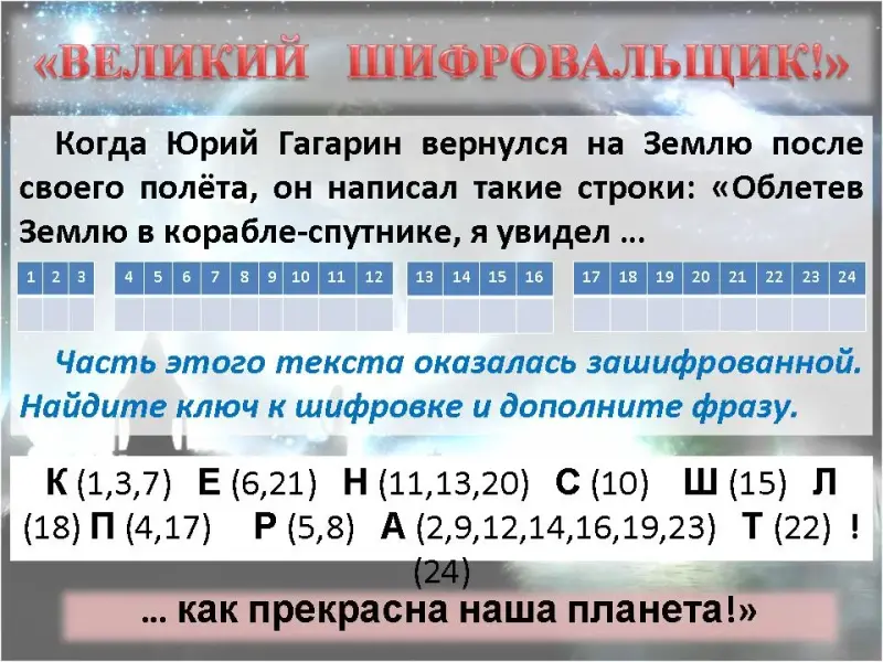 5. Великий шифровальщик! Когда Юрий Гагарин вернулся на Землю после своего полёта, он написал такие строки: «Облетев Землю в корабле-спутнике, я увидел … (… как прекрасна наша планета!») (раздаточный материал)(Приложение 2)