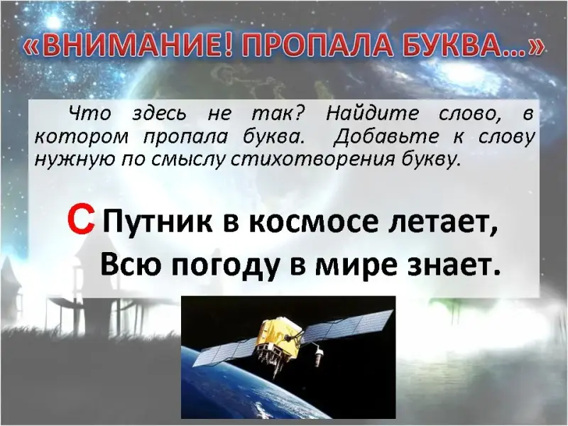 6. ВНИМАНИЕ! ПРОПАЛА БУКВА… Что здесь не так? Найдите слово, в котором пропала буква. Добавьте к слову нужную по смыслу стихотворения букву.