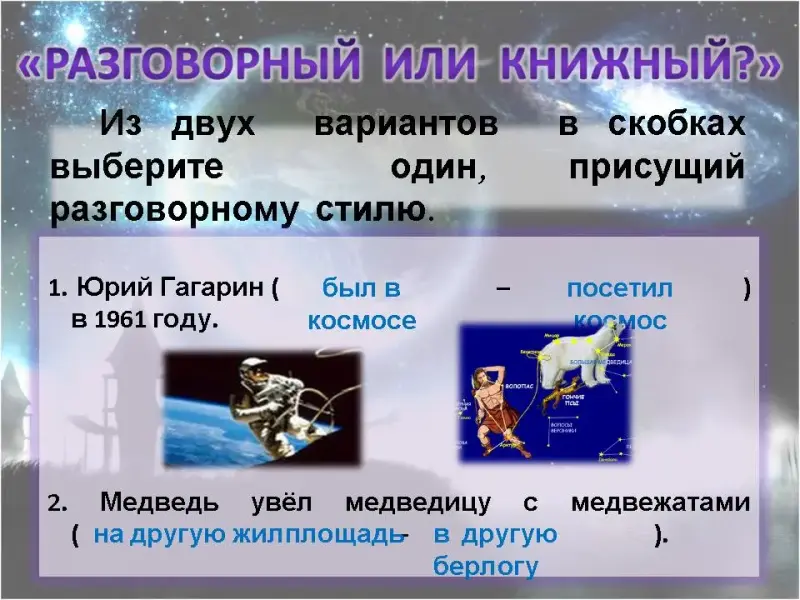 7. Разговорный или книжный? Из двух вариантов в скобках выберите один, присущий разговорному стилю.