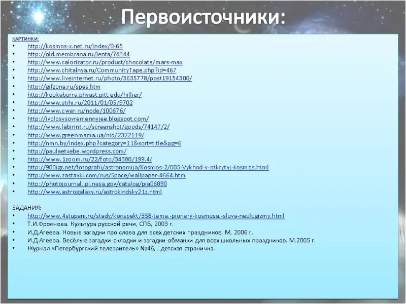 В школе ежегодно проводится игра по станциям. В этой игре есть станция, посвящённая русскому языку и развитию речи. 12 апреля 2011 года была проведена игра, посвящённая 50-летию со дня первого полёта человека в космос. В связи с этим мы назвали станцию так: «Звёздные тайны русского языка». К игре были подготовлены 10 заданий. За каждый правильный ответ начислялись два балла. На уроке использовались разные формы работы: коллективная и индивидуальная, различные виды деятельности. Большинство заданий проецировались на экран с помощью проектора и компьютера, презентация к игре-уроку выполнена в программе Power Point, некоторые задания были в виде раздаточного материала, который надо было в письменном виде выполнить. Приглашаем Вас в космическое путешествие. Поехали! (Демонстрируется презентация).