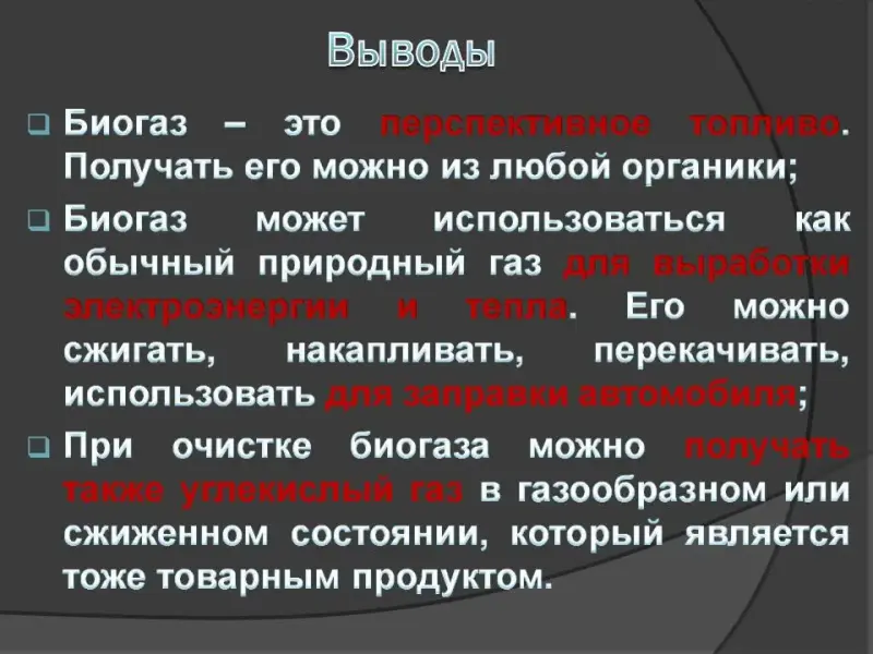 Ценностные ориентации. Биогаз - это перспективное топливо, которое можно получать из любой органики. На выходе получается не только топливо, но и идеальное удобрение, более эффективное, чем простой навоз. Биогаз может использоваться как обычный природный газ для выработки электроэнергии и тепла. Его можно сжигать, накапливать, перекачивать, использовать для заправки автомобиля.