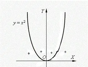 Хотя точка x = 0 является нулем функции, но функция при переходе через нуль знак не меняет. Данная функция относится к категории особых случаев и, так как четная степень функции не влияет на знак неравенства, перемены знака нет.