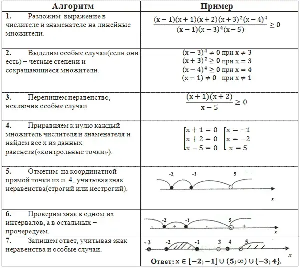 В следующем параграфе «Решение дробно-рациональных неравенств» нет речи ни о методе интервалов, ни об области допустимых значений дробно-рациональной функции. Точки, «полученные из знаменателя» отмечены так же как и точки, «полученные из числителя». «Разобраны» два примера и все.