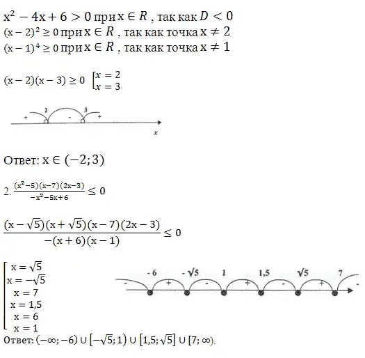 4) выбрать промежутки, в которых выражение имеет требуемый знак, записать ответ, взяв их в объединение