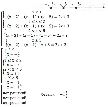 Решим уравнение: | x - 2 | + | x - 1 | - | x - 5 | = 2x + 3