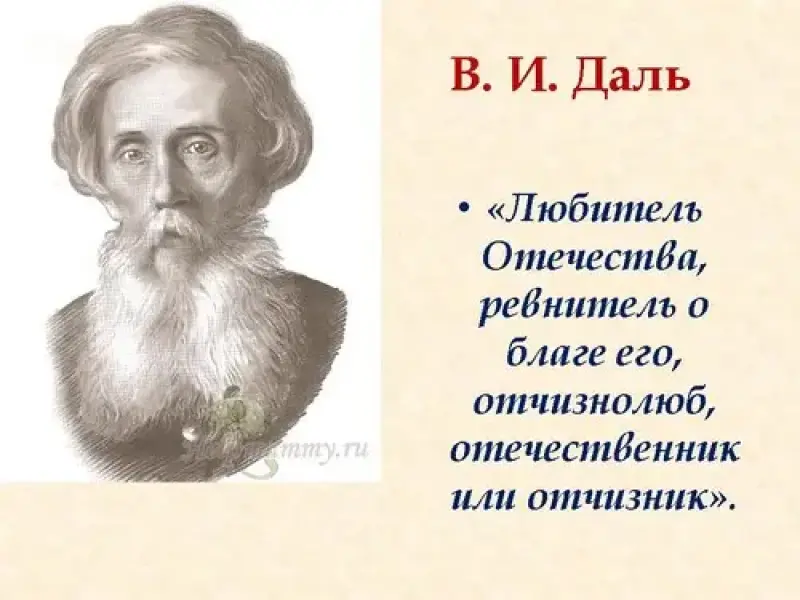 Благодаря В. И. Далю из минувших времен до нас доходит высокое значение понятия "патриот". Оно включает корни таких слов, как "Отчизна" и "Отечество".