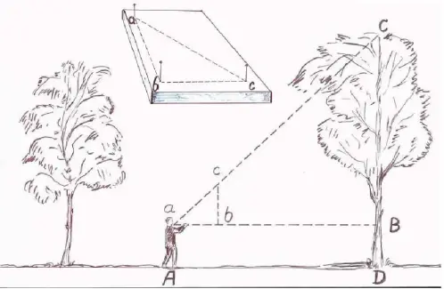 Обращение с ним не сложнее изготовления. Отойдя от измеряемого дерева, держите прибор так, чтобы один из катетов треугольника был направлен отвесно, для чего можете пользоваться ниточкой с грузиком, привязанной к верхней булавке. Приближаясь к дереву или удаляясь от него, вы всегда найдете такое место A, из которого, глядя на булавки a и с, увидите, что они покрывают верхушку C дерева: это значит, что продолжение гипотенузы ac проходит через точку C. Тогда, очевидно расстояние aB равно CB, так как угол a = 45° .Следовательно, измерив, расстояние aB (или, на ровном месте, одинаковое с ним расстояние AD) и прибавив BD, т. е. Возвышение aA глаза над землей, получите искомую высоту дерева.