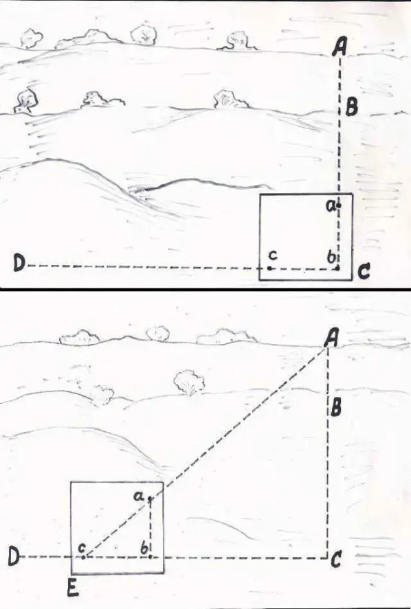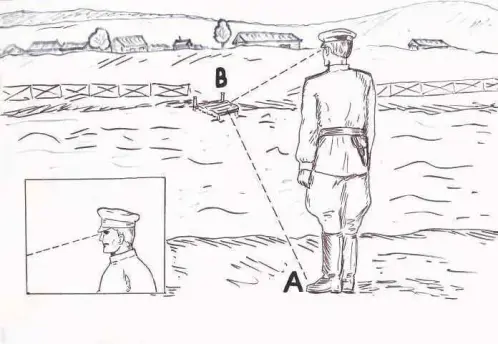 Способ этот состоит в следующем. Надо стать лицом к реке и надвинуть фуражку на глаза так, чтобы нижний обрез козырька точно совпал с линией противоположного берега. Козырек можно заменить ладонью руки или записной книжкой, плотно приложенной ребром ко лбу. Затем, не изменяя положения головы, надо повернутся направо или налево, или даже назад ( в ту сторону где поровнее площадка, доступная для измерения расстояния) и заметить самую длинную точку, видимую из под козырька ( ладони, записной книжки).