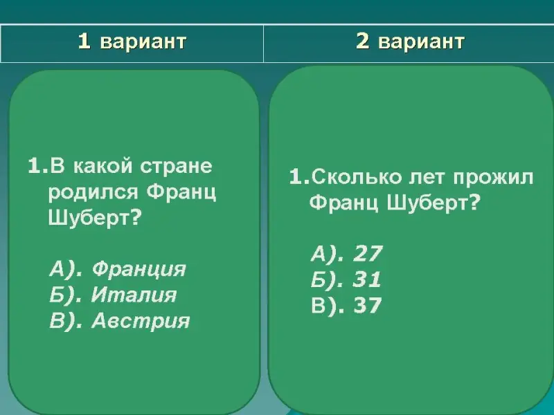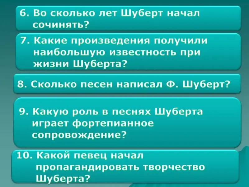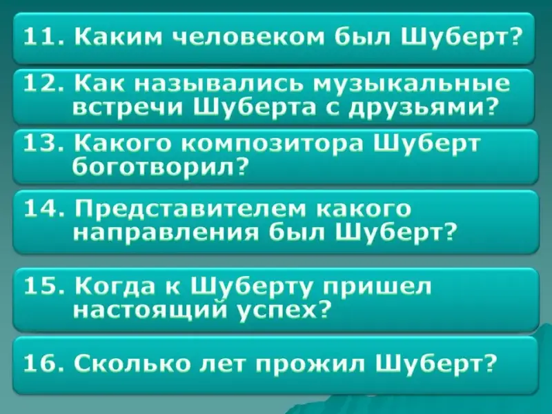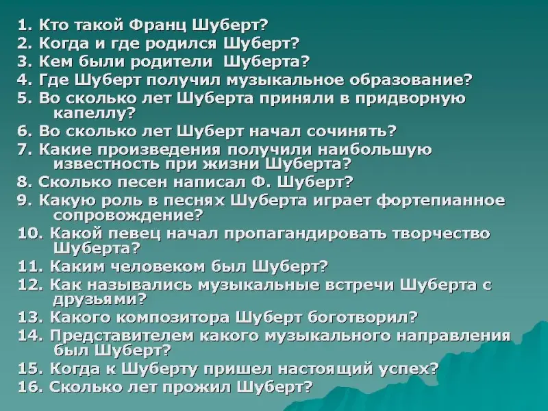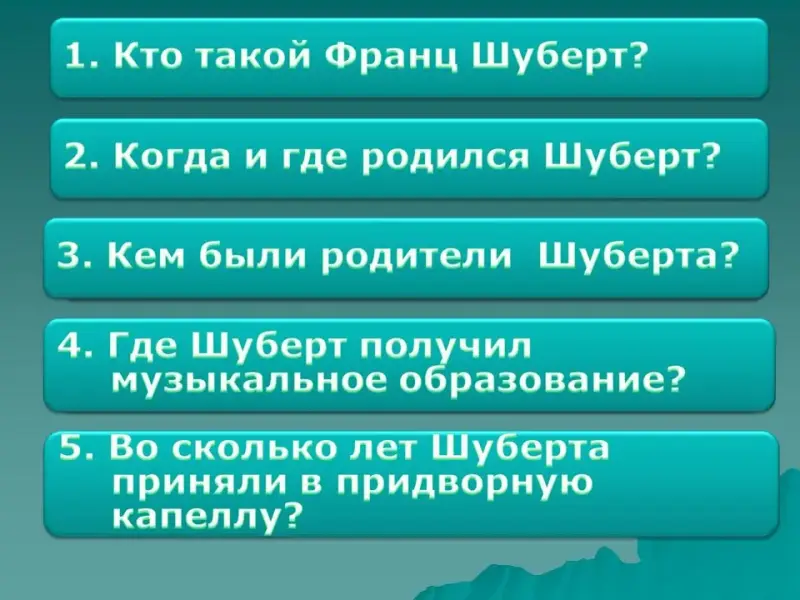 (Учитель, называя порядковый номер, задает вопросы. Каждый ученик по порядку отвечает на свой вопрос, из ответов выстраивается биография Шуберта. Все ответы появляются на слайде.)