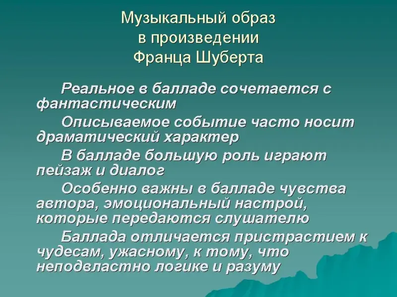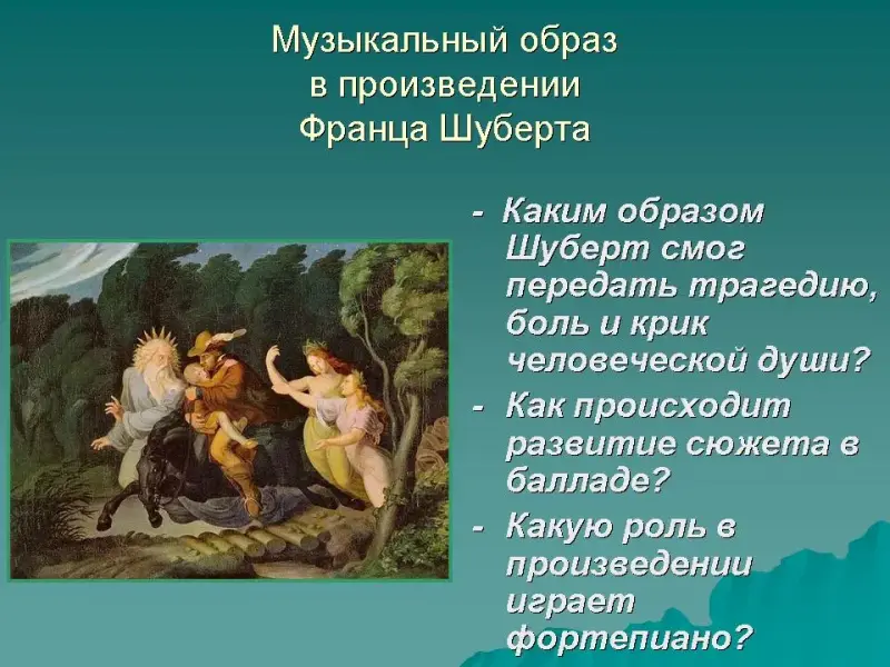 Цель урока: формирование эмоционально-осознанного восприятия музыкального образа на примере баллады «Лесной царь» Ф. Шуберта.