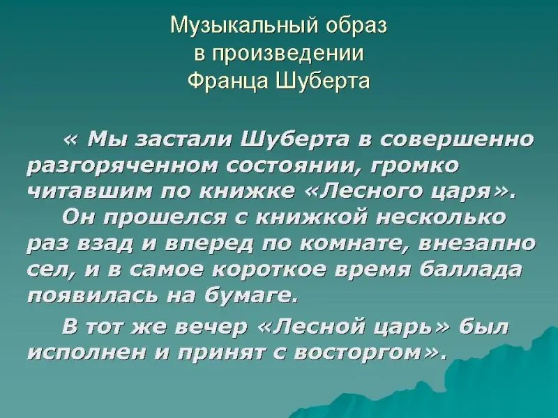 - Вот как описывает рождение этой песни один из друзей Шуберта: « Мы застали Шуберта в совершенно разгоряченном состоянии, громко читавшим по книжке «Лесного царя». Он прошелся с книжкой несколько раз взад и вперед по комнате, внезапно сел, и в самое короткое время баллада появилась на бумаге. В тот же вечер «Лесной царь» был исполнен и принят с восторгом».