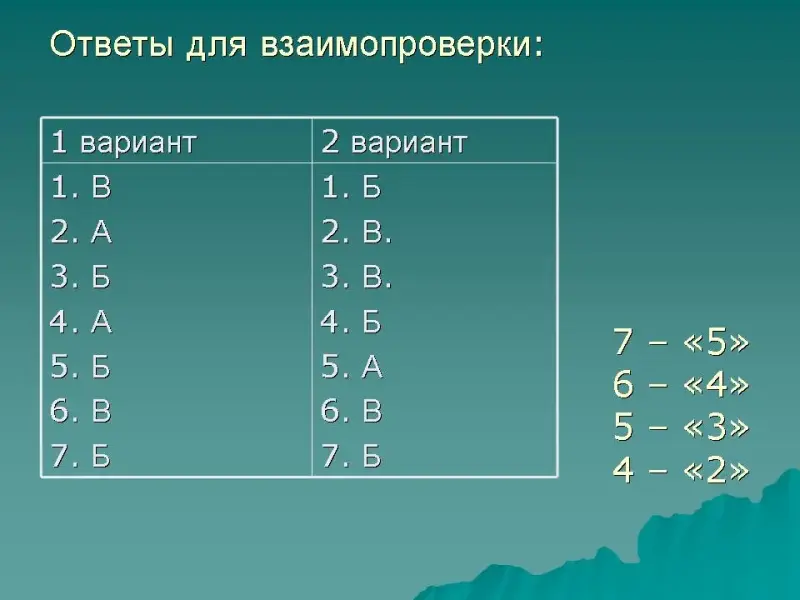 Ответы для взаимопроверки: 7 - «5», 6 - «4», 5 - «3», 4 - «2».