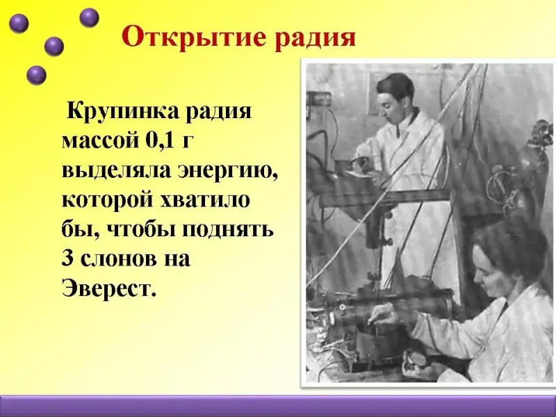 В 1898г супруги Пьер и Мария Кюри открыли новые, ранее неизвестные элементы - полоний 209Po и радий 226Ra, у которых излучение, аналогичное излучению урана, было значительно более сильным. Радий - редкий элемент; чтобы получить 1 грамм чистого радия, надо переработать не менее 5 тонн урановой руды; его радиоактивность в несколько миллионов раз выше радиоактивности урана. Слайд №6.