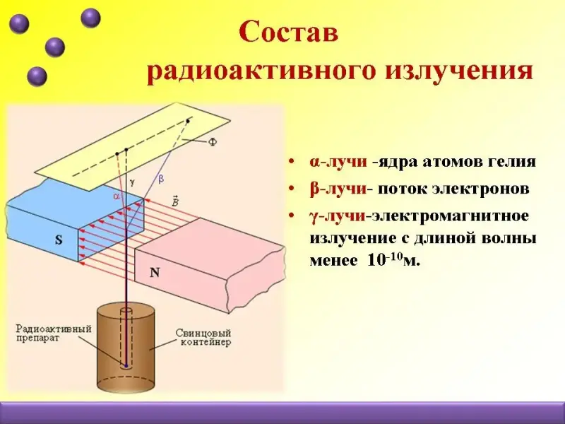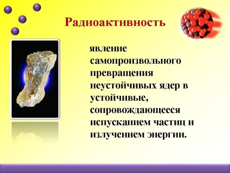 Цели урока: ввести и закрепить понятия радиоактивности, альфа-, бета-, гамма-излучения и периода полураспада; изучить правило смещения и закон радиоактивного распада.