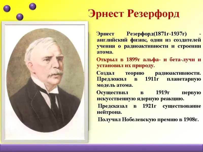 - Изучением природы радиоактивного излучения занимался великий физик начала 20 века Эрнест Резерфорд. Ребята, давайте прослушаем сообщение о биографии Э.Резерфорда. Приложение №4, Слайд №9.