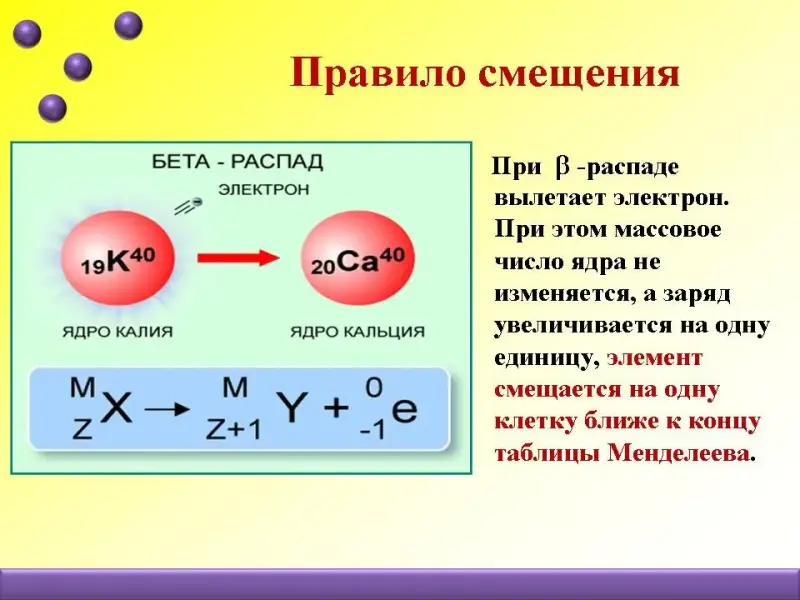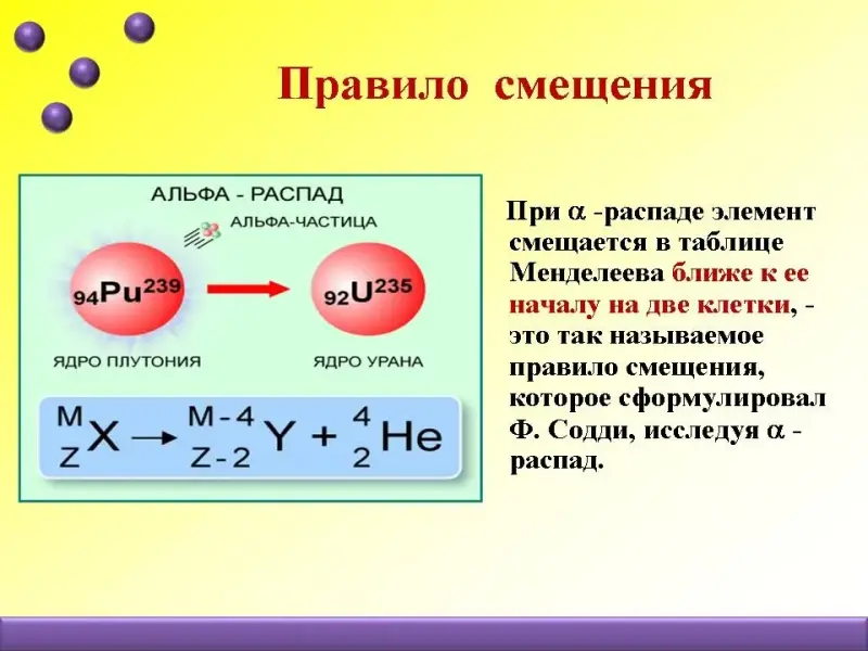 Эти два распада подчиняются правилам смещения, которые впервые сформулировал английский ученый Ф.Содди. Давайте посмотрим, как выглядят эти реакции.