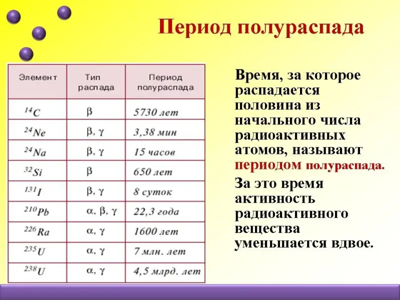 - Резерфорд опытным путём установил, что активность радиоактивных веществ убывает с течением времени. Для каждого радиоактивного вещества существует интервал времени, на протяжении которого активность убывает в 2 раза. Это время называется периодом полураспада Т.