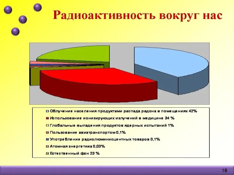 - Одинаково опасными являются как быстро, так и медленно распадающиеся ядра. Быстро распадающиеся ядра интенсивно излучают за малый промежуток времени, а медленно распадающиеся ядра радиоактивны на большом интервале времени. С различными уровнями радиации человечество встречается как в естественных условиях, так и в искусственно созданных обстоятельствах. Слайд № 18.