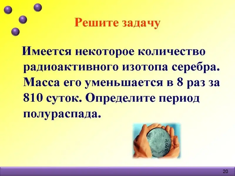 - И в заключение нашего урока давайте решим задачу на нахождение периода полураспада. Слайд №20.