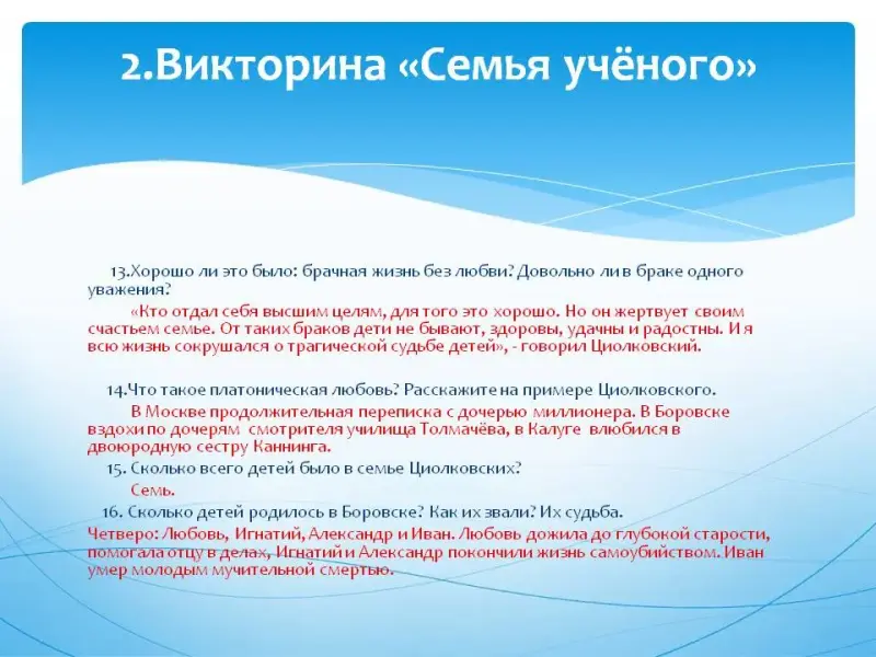 - Викторина «Семья Циолковского» Слайды 10-14.
