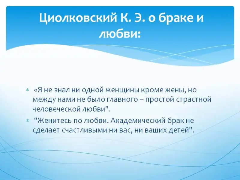 Слайд 39. Циолковский К. Э. о браке и любви:
