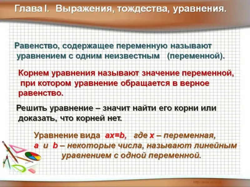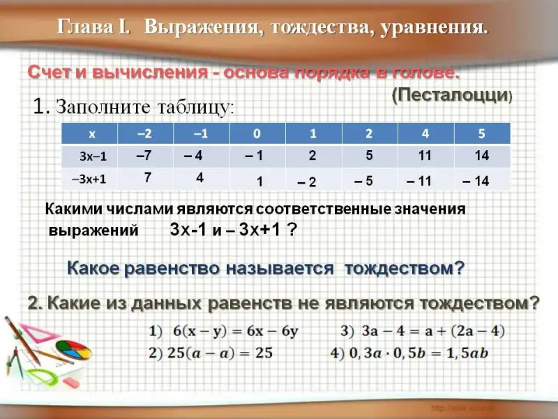 Вспомним, как вычисляется значение выражения с переменной, какие числа называются противоположными, что такое тождество, что такое уравнение, корень уравнения, что значит решить уравнение, правила раскрытия скобок. (Слайды 4-6).
