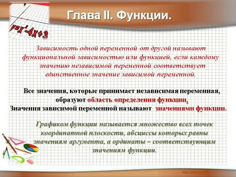- Зависимость одной переменной от другой называют функциональной зависимостью или функцией, если каждому значению независимой переменной соответствует единственное значение зависимой переменной.