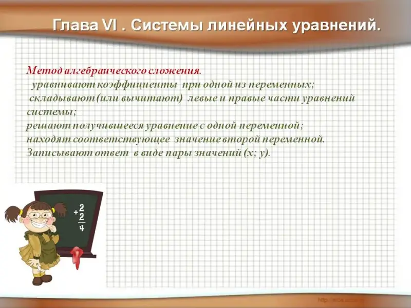 Повторить понятие линейного уравнения с двумя переменными, системы линейных уравнений с двумя переменными и способы их решений: графический, подстановки, алгебраического сложения.