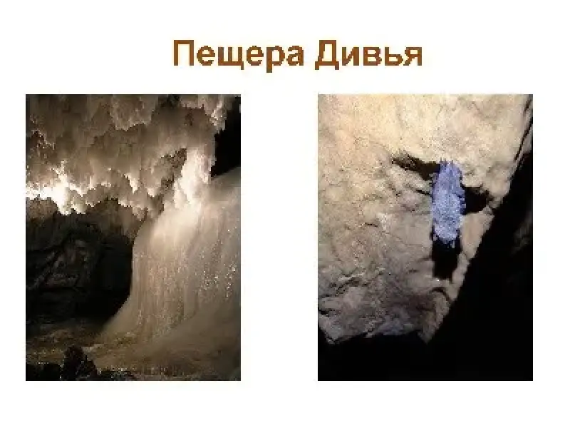 Дивья пещера -самая крупная двухъярусная пещера Урала в 10 километрах от поселка Ныроб. Длина пещеры 3 километра 200 метров. Названа от слова "диво" - чудесный, прекрасный. "Сколько известно нам пещер, то ни в одной из них не видно, чтоб натура столь щедро источила в них редкости творения своего" - П.И.Рычков. На поверхности подземных озер плавает кальцит. Знаменита редким пещерным жемчугом. Кальцитовые натеки похожи на занавесы с кружевной бахромой, грозди винограда. Здесь обитают летучие мыши. Входное отверстие узкое, лазы низкие, что составляет трудность в изучении пещеры.