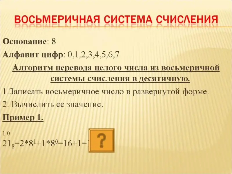 Сегодня на уроке мы с вами познакомимся с восьмеричной системой счисления и отработаем навыки перевода из одной системы счисления в другую.