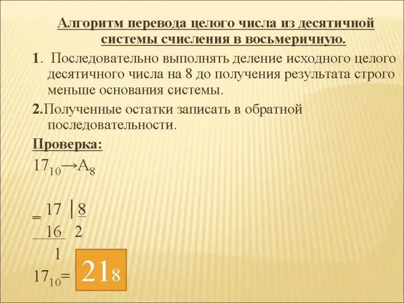 Алгоритм перевода целого числа из десятичной системы счисления в восьмеричную.