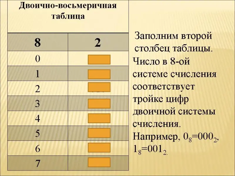 Мы научились переводить числа из одной системы в другую, а теперь рассмотрим способы переводов, которые не требуют от нас каких-либо вычислений. Для этого в тетради начертим таблицу, состоящую из двух столбцов. Число в 8-ой системе счисления соответствует тройке цифр двоичной системы счисления. Например, 08=0002, 18=0012, далее обратимся к проверяемому в начале урока домашнему заданию. Таблица легко заполняется.
