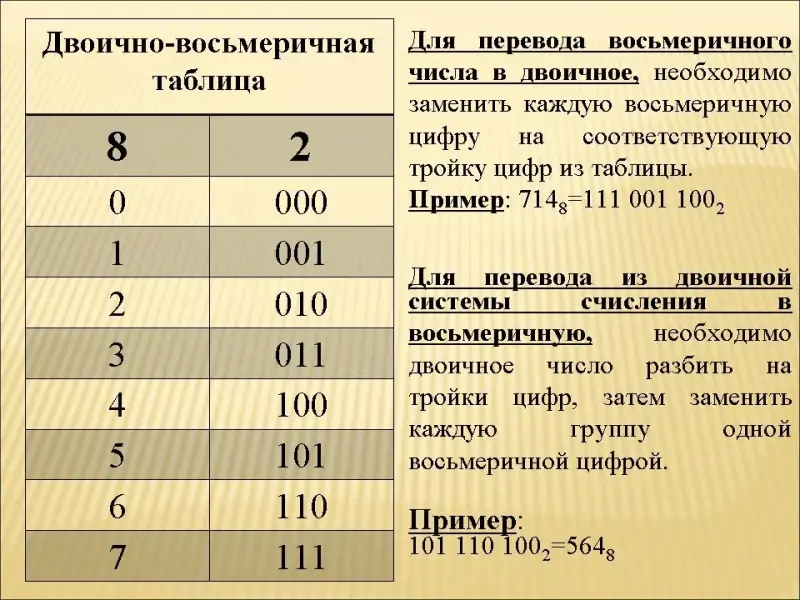 При переводе восьмеричного числа в двоичное заменяют каждую восьмеричную цифру на соответствующую тройку цифр из таблицы. Для обратной операции, то есть для перевода из двоичной в восьмеричную систему, двоичное число разбивают на тройки цифр, потом заменяют каждую группу одной восьмеричной цифрой.