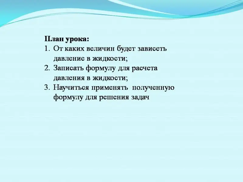 Какой вы составите план для изучения данной темы? (1. От каких величин будет зависеть давление в жидкости; 2. Записать формулу для расчета давления в жидкости; 3. Научиться применять полученную формулу для решения задач) (слайд 3)