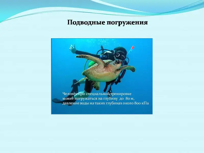 В презентации 2 «Подводные погружения» использован фрагмент слайд-шоу с диска «Электронные уроки и тесты. Физика в школе. Молекулярная структура материи» тема 3 «Гидростатическое давление». При наличии диска презентацию 2 можно заменить данным слайд-шоу.