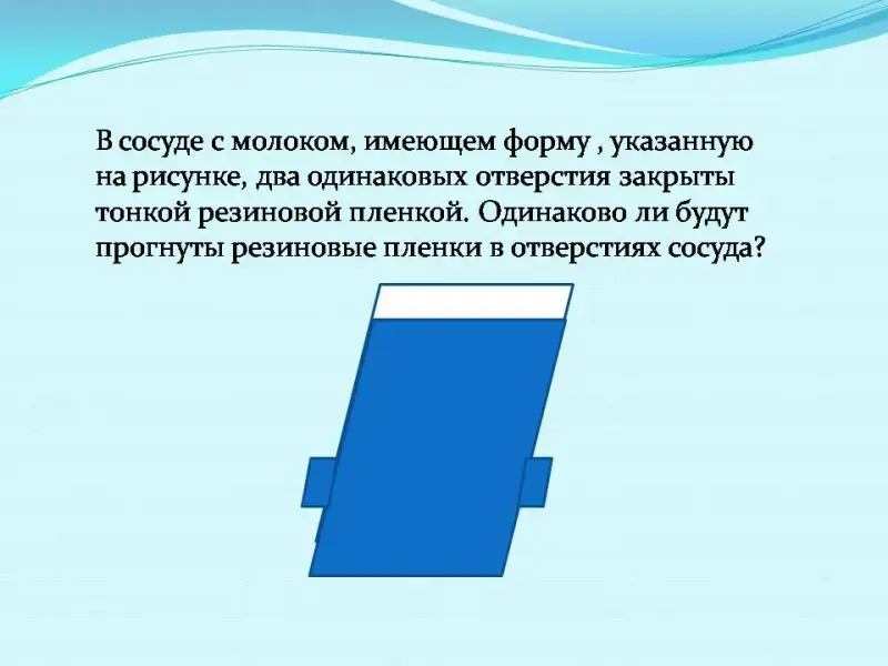 Рисунок 5 - В сосуде с молоком, имеющем форму, указанную на рисунке, два одинаковых отверстия закрыты тонкой резиновой пленкой. Одинаково ли будут прогнуты резиновые пленки в отверстиях сосуда?