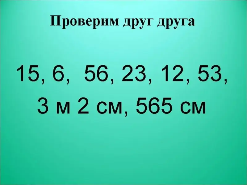 - Прочитайте последний ответ. Выразите его в разных единицах измерения. (5м6дм5см, 5м65см,56дм5см).