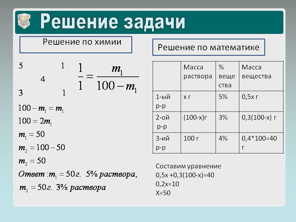 | Масса расвора | % вещества | Масса вещества | |