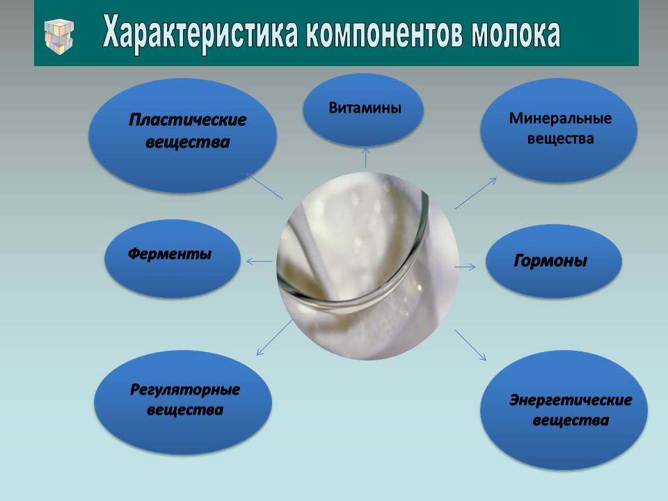 В состав молока входит свыше 200 различных компонентов, которые легко усваиваются. Химически в состав молока входят пластические, минеральные, энергетические, регуляторные вещества. В молоке содержатся белки — казеин, альбумин и глобулин; из них преобладает казеин (около 80% от количества белков молока). Белки молока особенно ценны, так как они содержат все жизненно необходимые аминокислоты, поэтому их относят к группе полноценных. В состав минеральных веществ молока входят все элементы периодической системы Д. И. Менделеева. В молоке найдены соли кальция, калия, магния, натрия, железа, молочной, серной, лимонной, фосфорной, соляной кислот и ряд других. Они находятся в виде растворов в легкоусвояемой форме. Больше половины минеральных веществ молока составляют соли кальция и фосфора. Углеводы молока. Они представлены моносахаридами (глюкоза, галактоза), их производными, дисахаридом – лактозой (молочным сахаром) и более сложными – моносахаридами. Молочный жир – богатый источник энергии для организма. Жир легко усваивается. В молоке жир находится в виде мелких шариков.