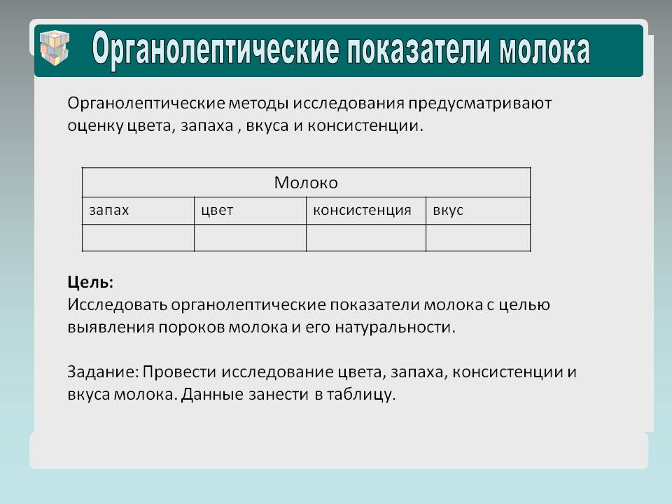 Задание: Провести исследование цвета, запаха, консистенции и вкуса молока в соответствии с инструктивной карточкой.
