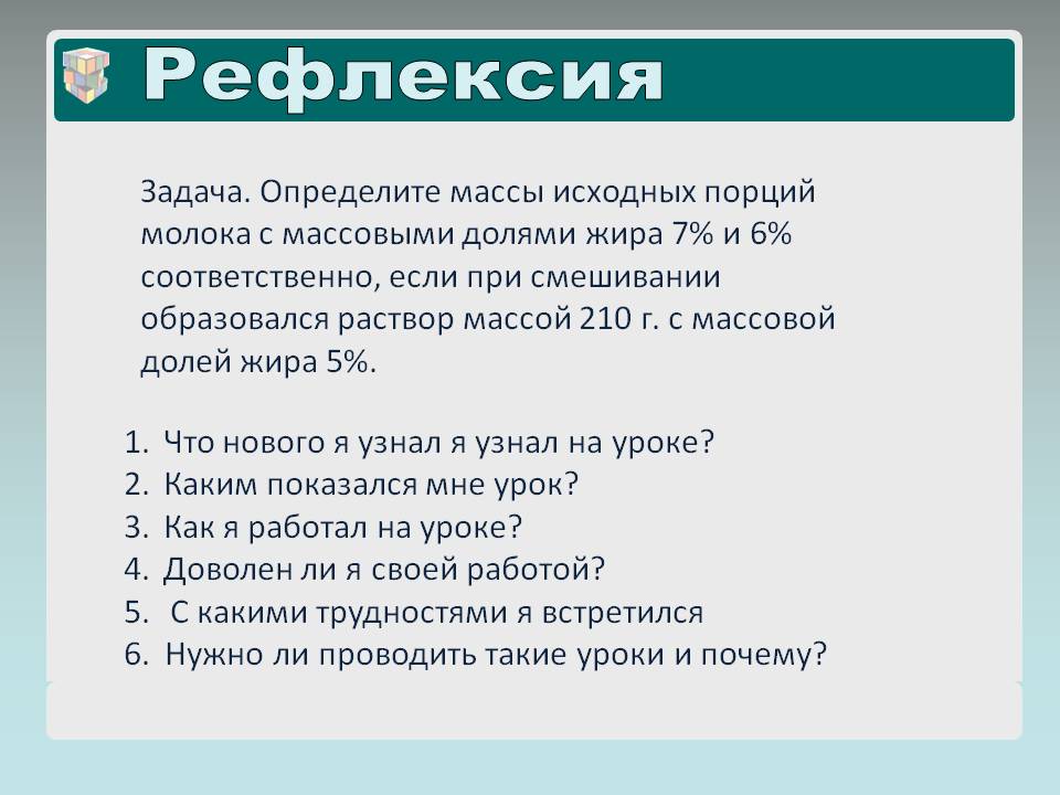 Задача: Определите массы исходных порций молока с массовыми долями жира 7% и 6% соответственно, если при смешивании образовался раствор массой 210г с массовой долей жира 5 %.